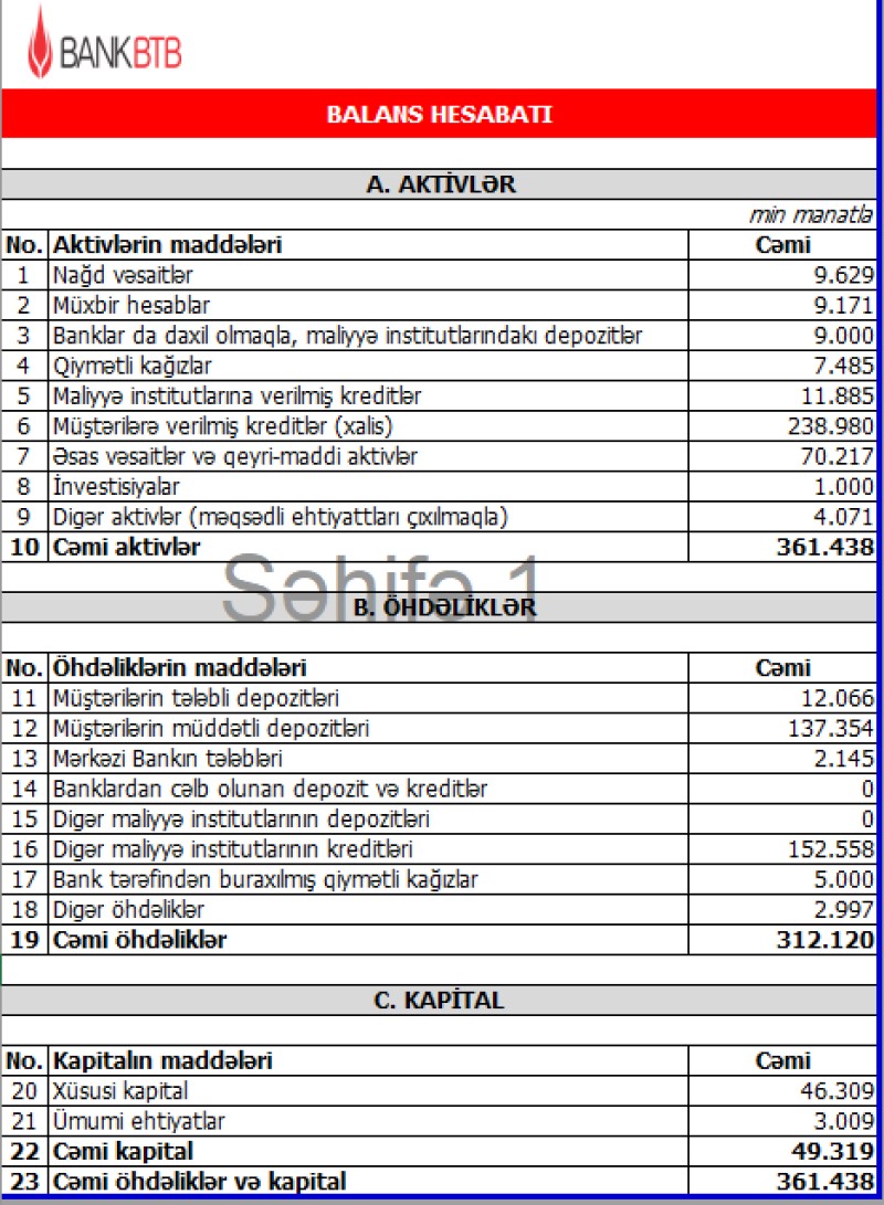 Müqayisə üçün qeyd edək ki, 2021-ci ilin yanvar-sentyabr dövründə "Bank BTB"nnin cəmi əməliyyat gəlirləri 22 milyon 395 min manat, cəmi əməliyyat xərcləri (faiz və qeyri-faiz xərcləri) 22 milyon 332 min manat, əməliyyat mənfəəti 63 min manat təşkil etmişdi. Ehtimal olunan zərərlər üçün yaradılan ehtiyatdan 1 milyon 111 min manatın qayıtması hesabına mənfəət 1 milyon 174 min manata yüksəlmişdi.