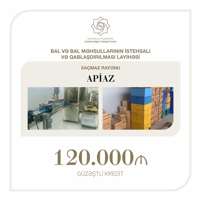 Nazir qeyd edib ki, "Apiaz" MMC-nin (Ballı markası) bal və bal məhsullarının istehsalı və qablaşdırılması layihəsinə 120 min manat güzəştli kredit verilib.