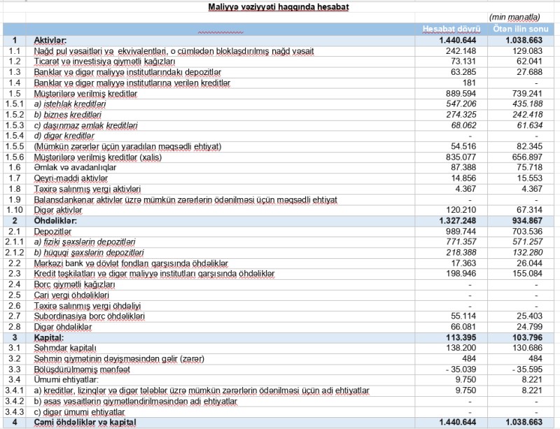 "Unibank"ın aktivləri 1,4 milyard manat, cəmi gəlirləri 200 milyon manat səviyyəsini aşıb.