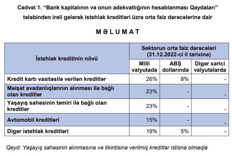31 dekabr 2022-ci il tarixinə istehlak kreditləri üzrə orta faiz dərəcələri açıqlanıb.
