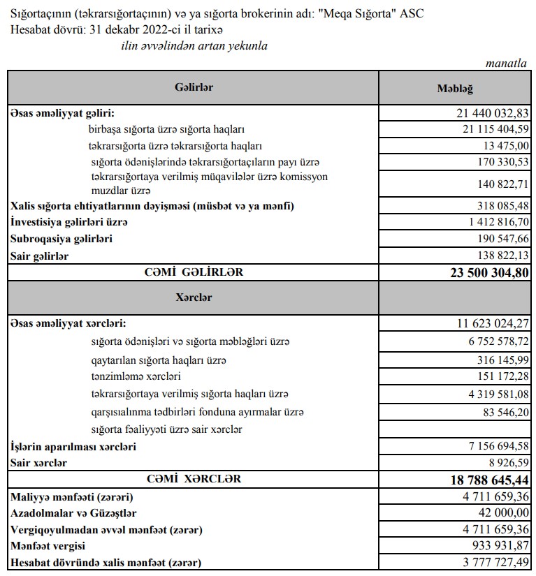 "Meqa Sığorta" ASC 2022-ci ili 3 milyon 778 min manat xalis mənfəət ilə başa vurub. Şirkət 2021-ci ili 3 milyon 920 min manat xalis mənfəət ilə bağlamışdı. Beləliklə, "Meqa Sığorta"nın xalis mənfəəti 2021-ci illə müqayisədə 2022-ci ildə 3,6% azalıb.