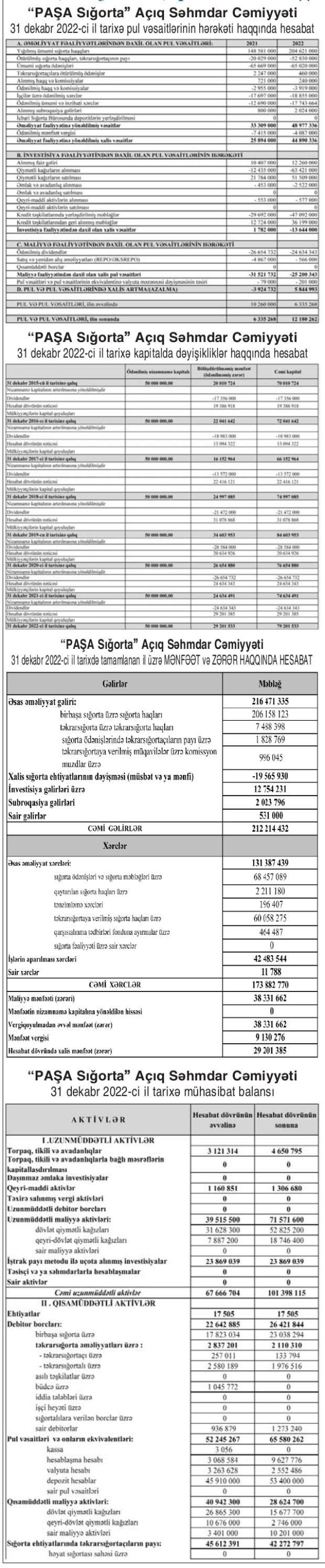 2021-ci ildə "PAŞA Sığorta"nın topladığı sğorta haqları 166 milyon 866 min manat ikən, 2022-ci ildə 206 milyon 158 min manat təşkil edib. Şirkətin sığorta ödənişləri isə 2021-ci ildəki 75 milyon 26 min manata qarşı, 2022-ci ildə 68 milyon 457 min manat olub.