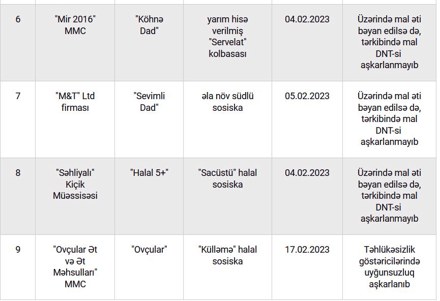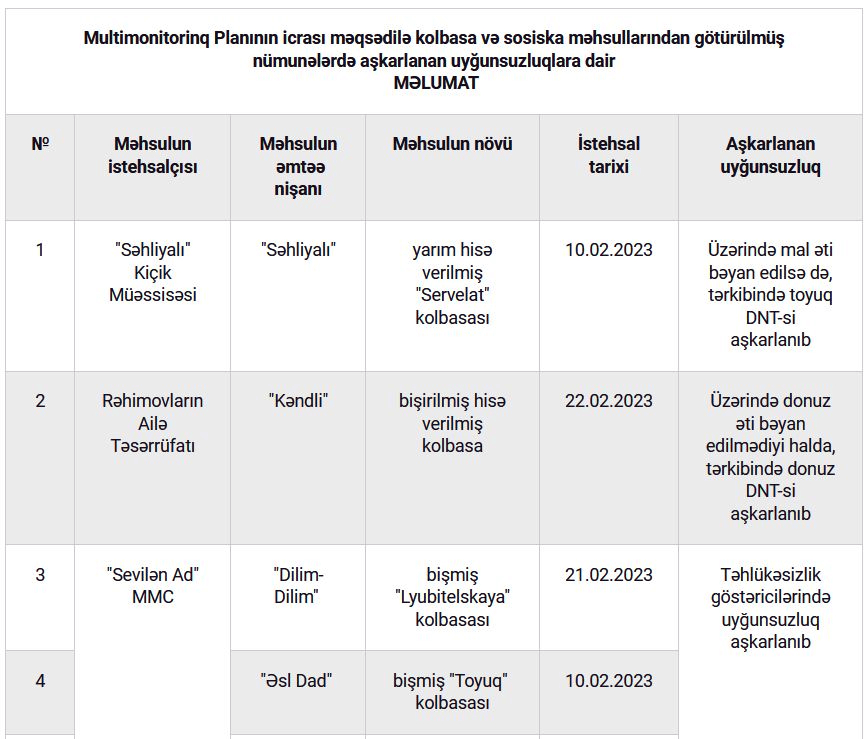 "Səhliyalı" Kiçik Müəssisəsi, Rəhimovların Ailə Təsərrüfatı, "Sevilən Ad" MMC və "Ovçular Ət və Ət Məhsulları" MMC-nin kolbasa və sosiska məhsullarında uyğunsuzluq aşkarlanıb.