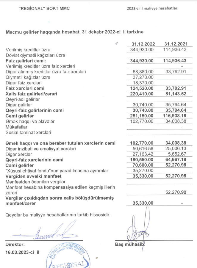 Marja xəbər verir ki, 2021-ci ildə “Regional” BOKT-un faiz gəlirləri 115 min manat ikən, 2022-ci ildə 345 min manat təşkil edib. Gəlirlərin artmasına qarşılıq, kredit şirkətinin faiz, əməkhaqqı, inzibati və digər xərcləri artdığı üçün xalis mənfəəti azalıb.