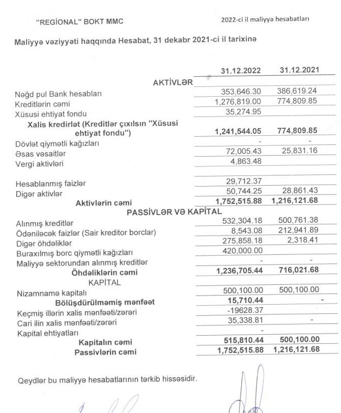 Ötən il “Regional” BOKT-un kredit portfeli (müştırilərə verilmiş kreditlər) 2021-ci ilin sonundakı 775 min manatdan 1 milyon 277 min manata yüksəlib.
