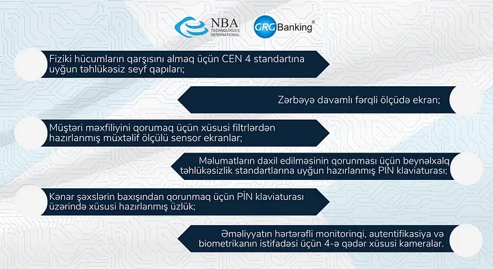 Bununla yanaşı “NBA Technologies İnternational” MMC şirkəti Azərbaycan bazarına GRG şirkətinin ən son modeli olan H68VL seriyalı bankomatlarının ətraflı təqdimatını keçirib.