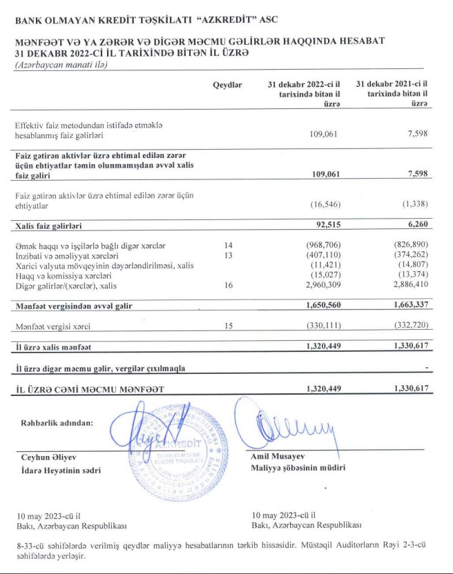 BOKT "Azkredit" ASC 2022-ci ili 1 milyon 320 min manat xalis mənfəət ilə başa vurub. Təşkilat 2021-ci ili 1 milyon 331 min manat xalis mənfəət ilə bağlamışdı.