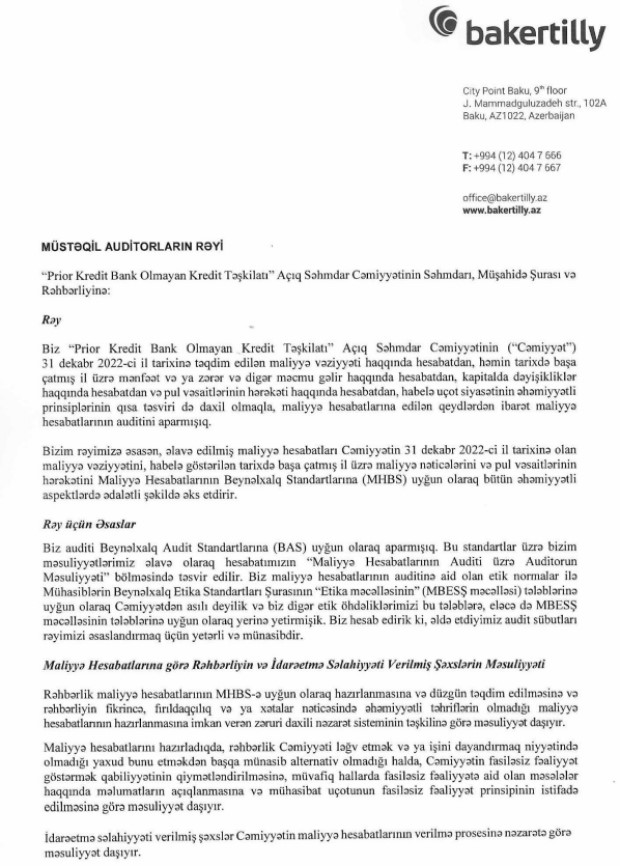 "Prior Credit BOKT" ASC-nin 31 dekabr 2022-ci il tarixində bitən il üzrə Maliyyə hesabatları və müstəqil auditor rəyi