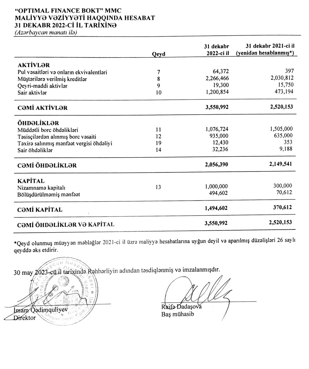 Azərbaycan Respublikasının Mərkəzi Bankı tərəfindən 29 dekabr 2020-ci il tarixdə verilmiş BKT-37 nömrəli lisenziya əsasında fəaliyyət göstərən “Optimal Finance Bank Olmayan Kredit Təşkilatı” Məhdud Məsuliyyətli Cəmiyyətinin 2022-ci il üçün kənar auditor tərəfindən təsdiqlənmiş illik maliyyə hesabatı ilə aşağıda tanış ola bilərsiniz.