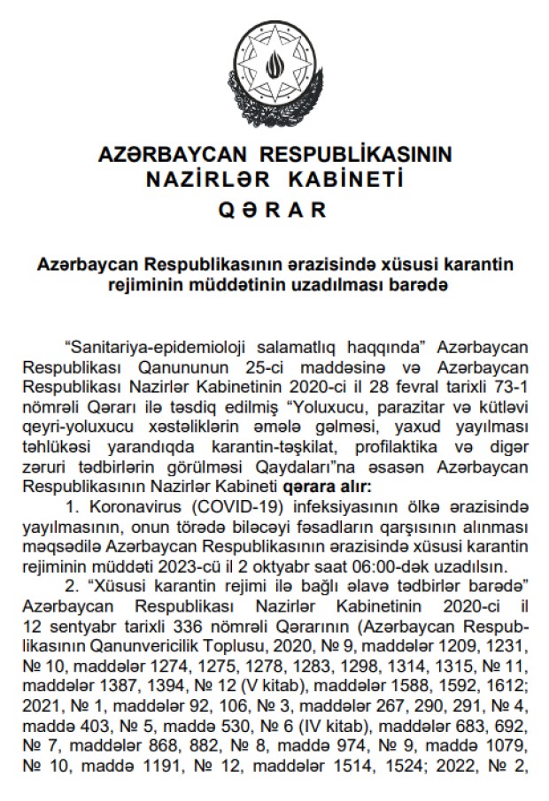 “Sanitariya-epidemioloji salamatlıq haqqında” Azərbaycan Respublikası Qanununun 25-ci maddəsinə və Azərbaycan Respublikası Nazirlər Kabinetinin 2020-ci il 28 fevral tarixli 73-1 nömrəli Qərarı ilə təsdiq edilmiş “Yoluxucu, parazitar və kütləvi qeyri-yoluxucu xəstəliklərin əmələ gəlməsi, yaxud yayılması təhlükəsi yarandıqda karantin-təşkilat, profilaktika və digər zəruri tədbirlərin görülməsi Qaydaları”na əsasən Azərbaycan Respublikasının Nazirlər Kabineti qərara alır: Koronavirus (COVID-19) infeksiyasının ölkə ərazisində yayılmasının, onun törədə biləcəyi fəsadların qarşısının alınması məqsədilə Azərbaycan Respublikasının ərazisində xüsusi karantin rejiminin müddəti 2023-cü il 2 oktyabr saat 06:00-dək uzadılsın",- Qərarda deyilir.
