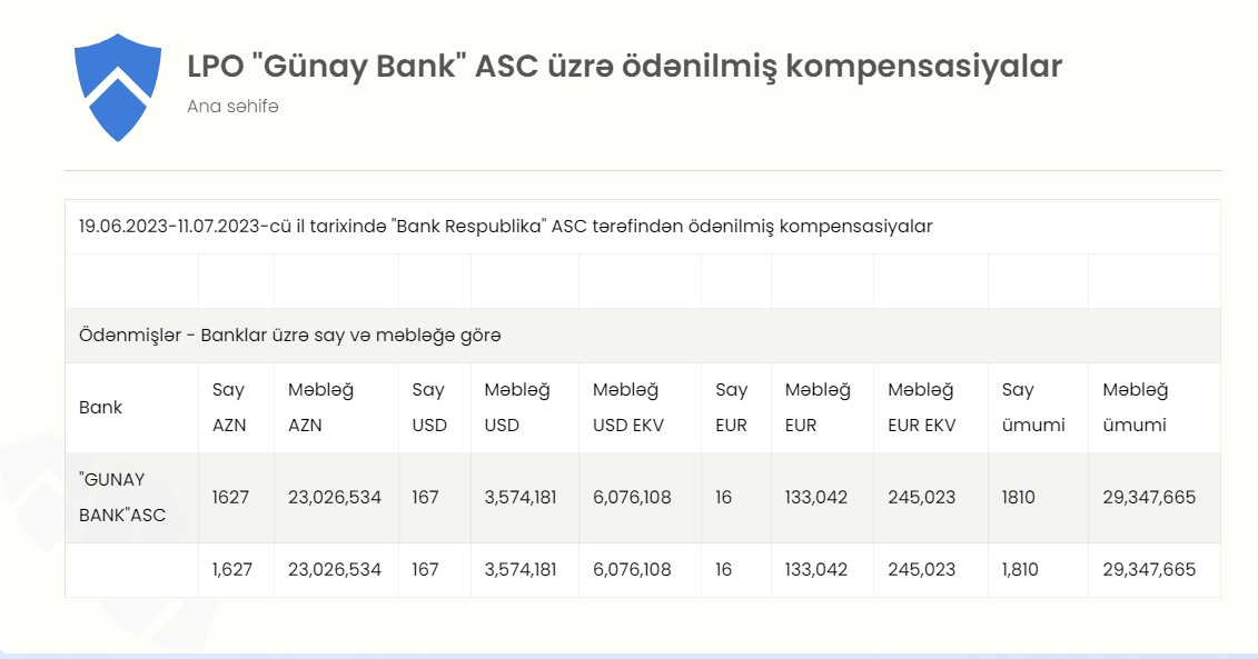19.06.2023-11.07.2023-cü il tarixində "Bank Respublika" ASC tərəfindən ləğv edilən "Günay Bank" ASC-nin qorunan əmanətçilərinə ödənilmiş kompensasiyaların məbləği açıqlanıb.