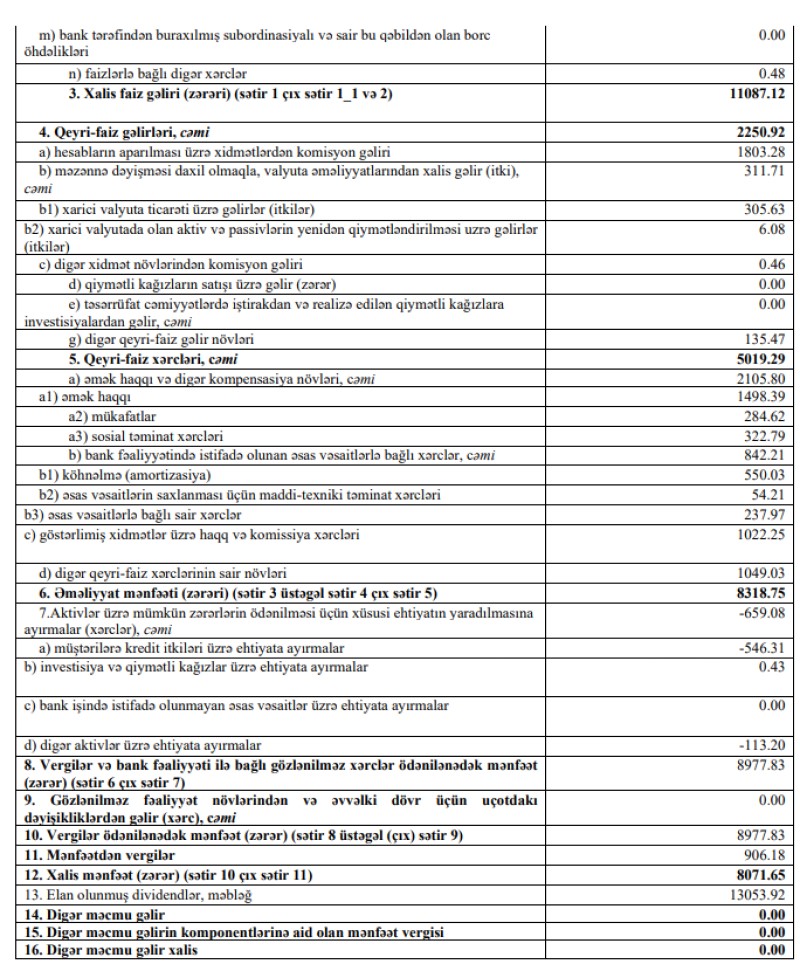 Müqayisə üçün qeyd edək ki, 2022-ci ilin birinci yarısında "Naxçıvanbank"ın cəmi əməliyyat gəlirləri 12 milyon 509 min manat, cəmi əməliyyat xərcləri (faiz və qeyri-faiz xərcləri) 4 milyon 335 min manat, əməliyyat mənfəəti 8 milyon 174 min manat təşkil etmişdi. Bank əməliyyat mənfəətindən 361 min manat aktivlər üzrə mümkün zərərlərin ödənilməsi üçün xüsusi ehtiyatın yaradılmasına ayırmışdı.