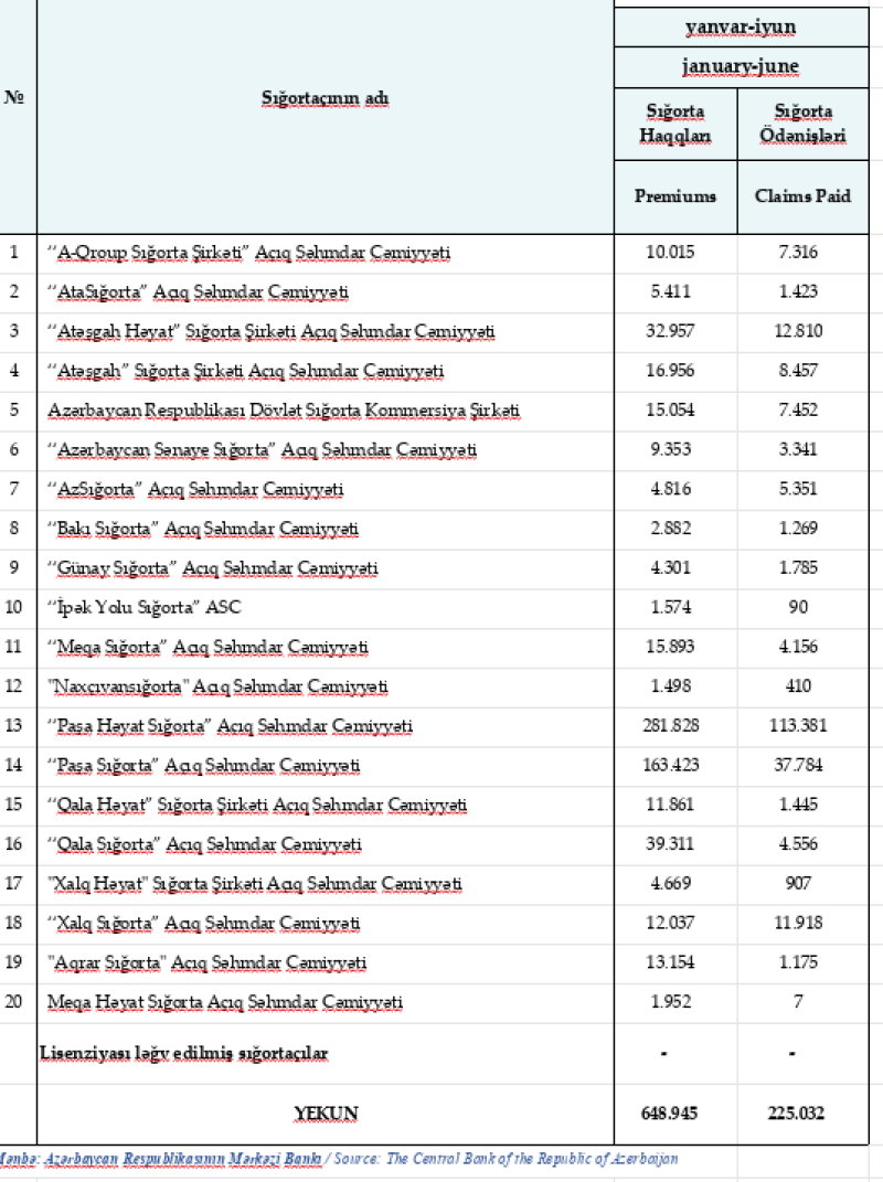 2023-cü ilin ilk 6 ayında (yanvar-iyun) Azərbaycanda fəaliyyət göstərən sığorta şirkətləri tərəfindən 648 milyon 945 min manat sığorta haqları hesablanıb.