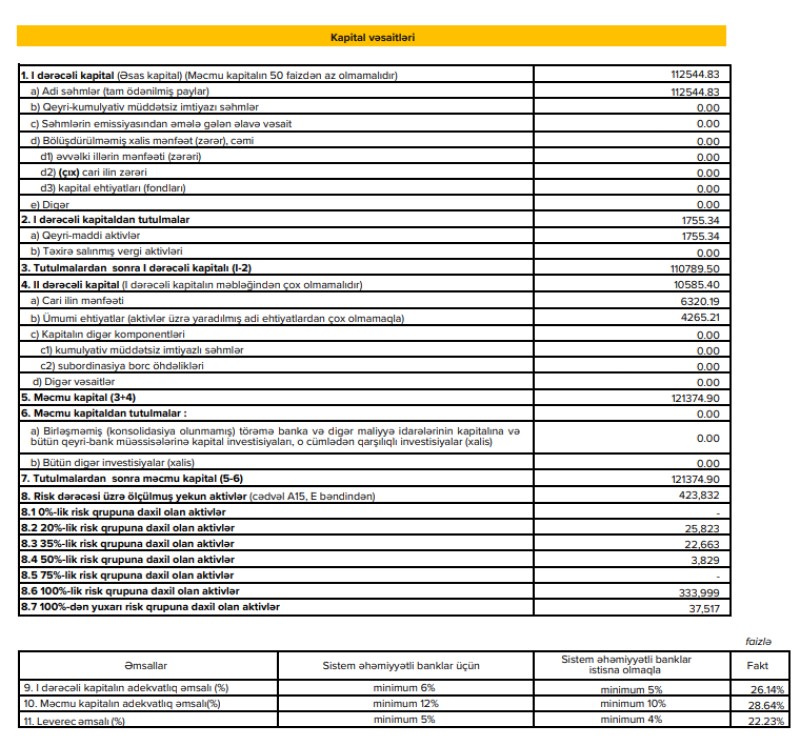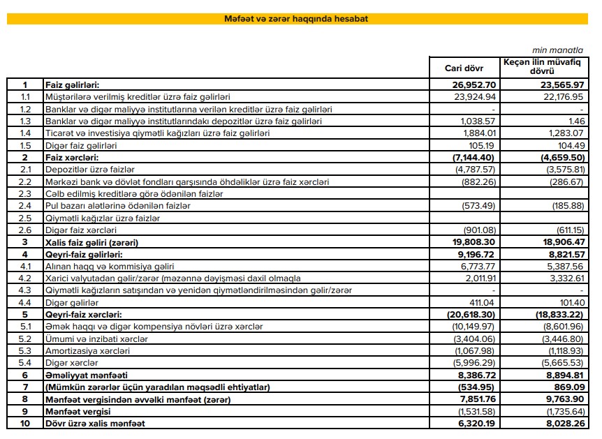 Kredit portfelindəki müsbət dinamika faiz gəlirlərinə də təsir göstərib. Bankın faiz gəlirləri 14.4% artaraq, 26.95 mln. manata yüksəlib. Qeyri-faiz gəlirləri isə 9.2 mln. manata çatıb.