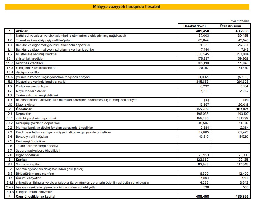Ötən ilin sonu ilə müqayisədə Bankın kredit portfelinin həcmi 18% artaraq, 350.55 mln. manat olub. Artım həm istehlak, həm də biznes kreditlərində müşahidə edilib.