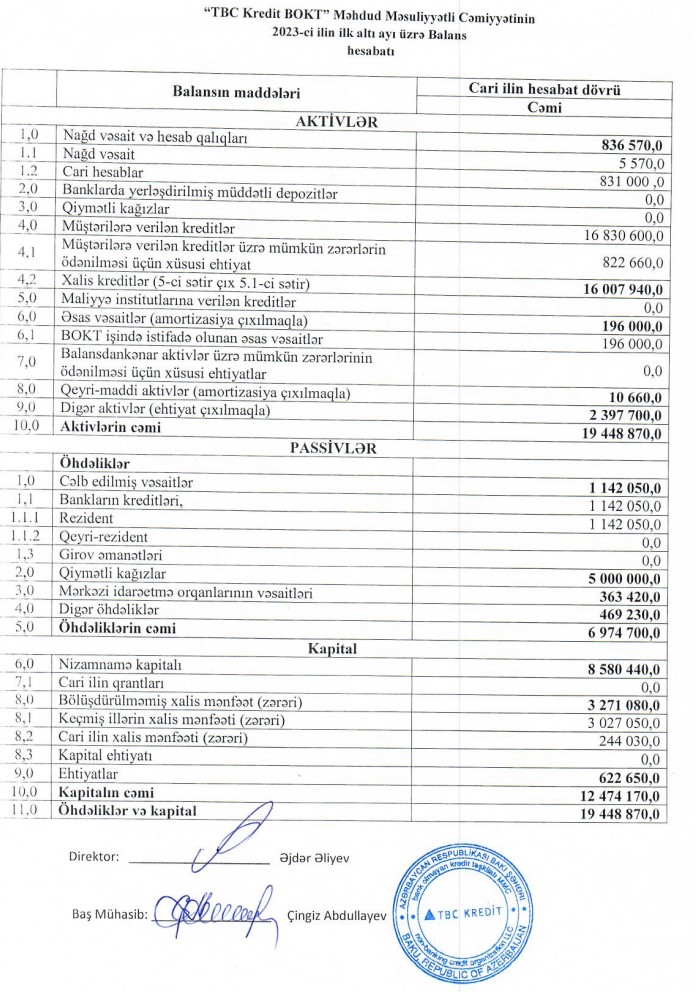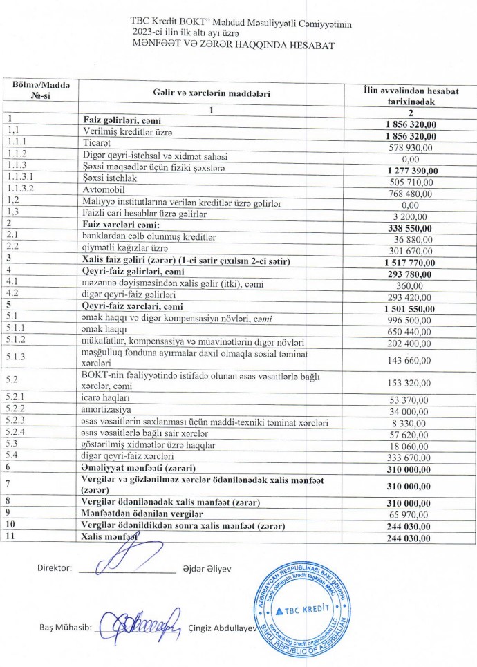 "TBC Kredit BOKT" MMC 2023-cü ilin ilk 6 ayını 244 min manat xalis mənfəət ilə başa vurub. Təşkilat 2022-ci ilin ilk 6 ayını 48 min manat xalis mənfəət ilə bağlamışdı. Beləliklə, "TBC Kredit BOKT"ın xalis mənfəəti 5 dəfədən çox artıb.
