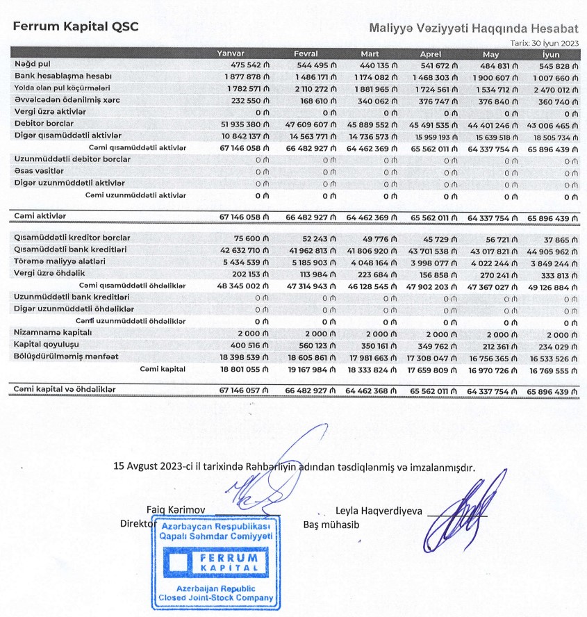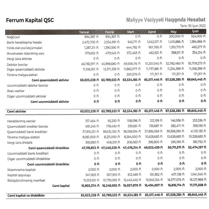 31 İyun 2022-ci il tarixində "Ferrum Kapital"ın cəmi kativləri 69 milyon 645 min manat ikən, 30 iyun 2023-cü il tarixində 65 milyon 896 min manat olub.