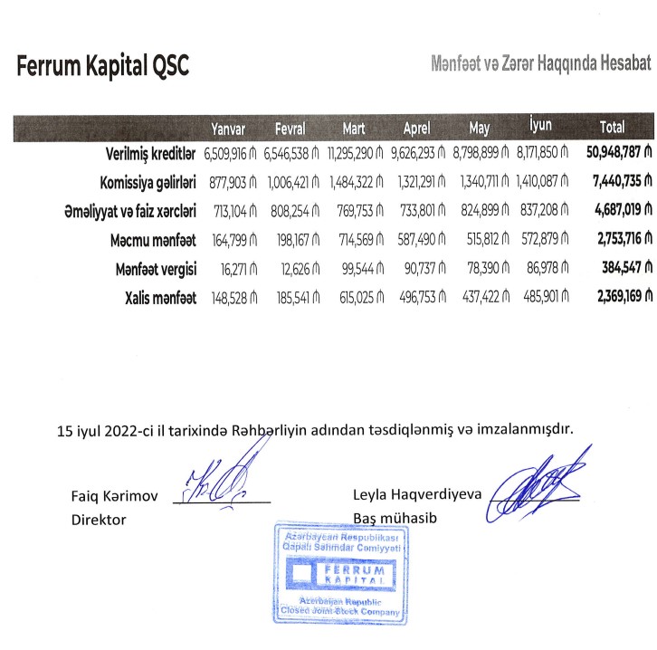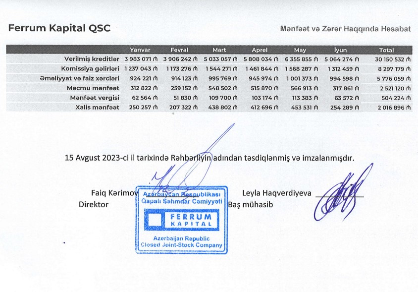 "AQA Şirkətlər Qrupu" QSC-yə daxil olan və faktorinq xidmətləri göstərən "Ferrum Kapital" QSC 2023-cü ilin ilk 6 ayını (yanvar-iyun) 2 milyon 17 min manat xalis mənfəət ilə başa vurub. Şirkət ötən ilin eyni dövrünü 2 milyon 369 min manat xalis mənfəət ilə bağalmışdı. Beləliklə, Şirkətin yarımillik xalis mənfəəti 352 min manat azalıb.