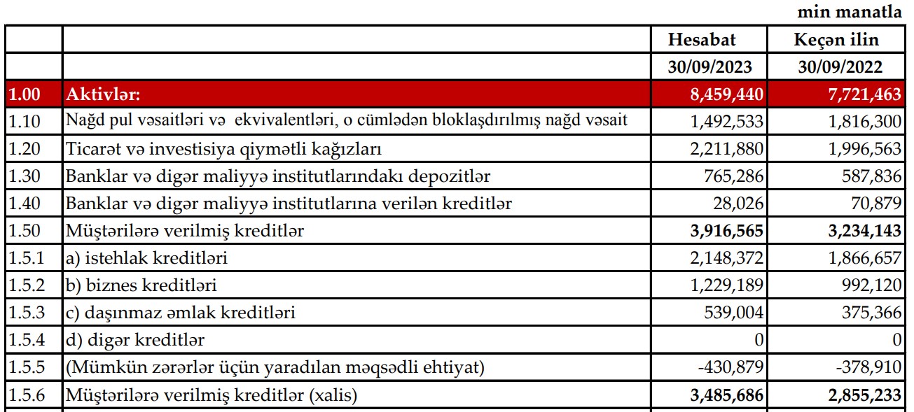 Marja.az xəbər verir ki, o cümlədən, Bankın istehlak kreditləri portfeli 281 milyon 715 min manat artaraq 2 milyard 148 milyon 372 min manata, biznes kreditləri portfeli 237 milyon 69 min manat artaraq 1 milyard 229 milyon 189 min manata, ipoteka kreditləri portfeli isə 163 milyon 638 min manat artaraq 539 milyon 4 min manata yüksəlib.