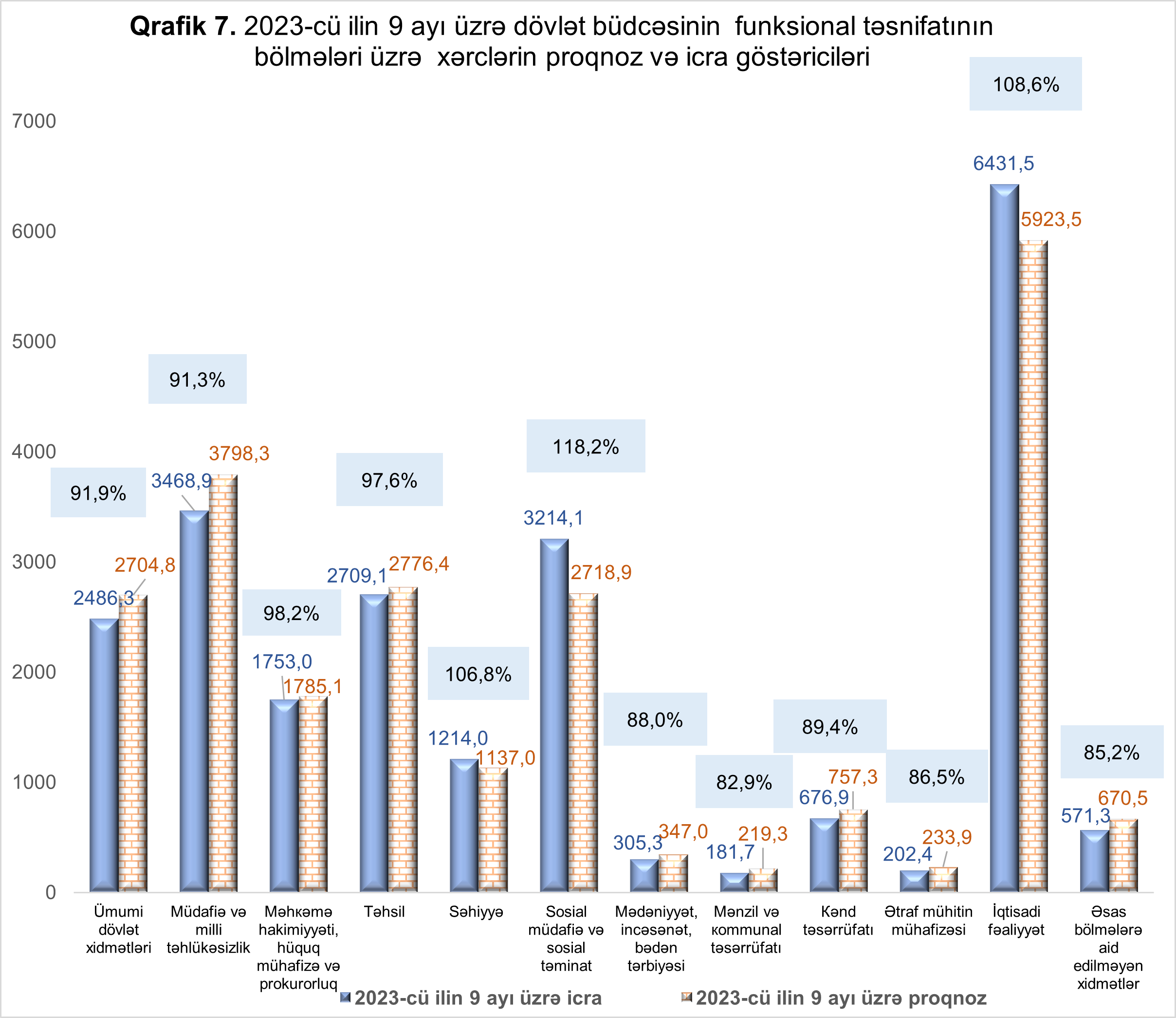 2023-cü ilin yanvar-sentyabr aylarında dövlət büdcəsinin funksional təsnifatına görə səhiyyə xərcləri 106,8 faiz icra edilməklə 1 milyard 214,0 milyon manat, sosial müdafiə və sosial təminat xərcləri 118,2 faiz icra edilməklə 3 milyard 214,1 milyon manat, təhsil xərcləri 97,6 faiz icra edilməklə 2 milyard 709,1 milyon manat, ümumi dövlət xidmətləri xərcləri 91,9 faiz icra edilməklə 2 milyard 486,3 milyon manat, kənd təsərrüfatı xərcləri 89,4 faiz icra edilməklə 676,9 milyon manat, iqtisadi fəaliyyət xərcləri 108,6 faiz icra edilməklə 6431,5 milyon manat, müdafiə və milli təhlükəsizlik xərcləri 91,3 faiz icra edilməklə 3 milyard 468,9 milyon manat, məhkəmə hakimiyyəti, hüquq-mühafizə və prokurorluq bölməsi üzrə xərcləri 98,2 faiz icra edilməklə 1 milyard 753,0 milyon manat, mədəniyyət, incəsənət, informasiya, bədən tərbiyəsi, gənclər siyasəti və bu qəbildən olan digər fəaliyyət xərcləri 88,0 faiz icra edilməklə 305,3 milyon manat, ətraf mühitin mühafizəsi xərcləri 86,5 faiz icra edilməklə 202,4 milyon manat, mənzil və kommunal təsərrüfatı xərcləri 82,9 faiz icra edilməklə 181,7 milyon manat, əsas bölmələrə aid edilməyən xidmətlər bölməsi üzrə xərcləri 85,2 faiz icra edilərək 571,3 milyon manat təşkil etmişdir.