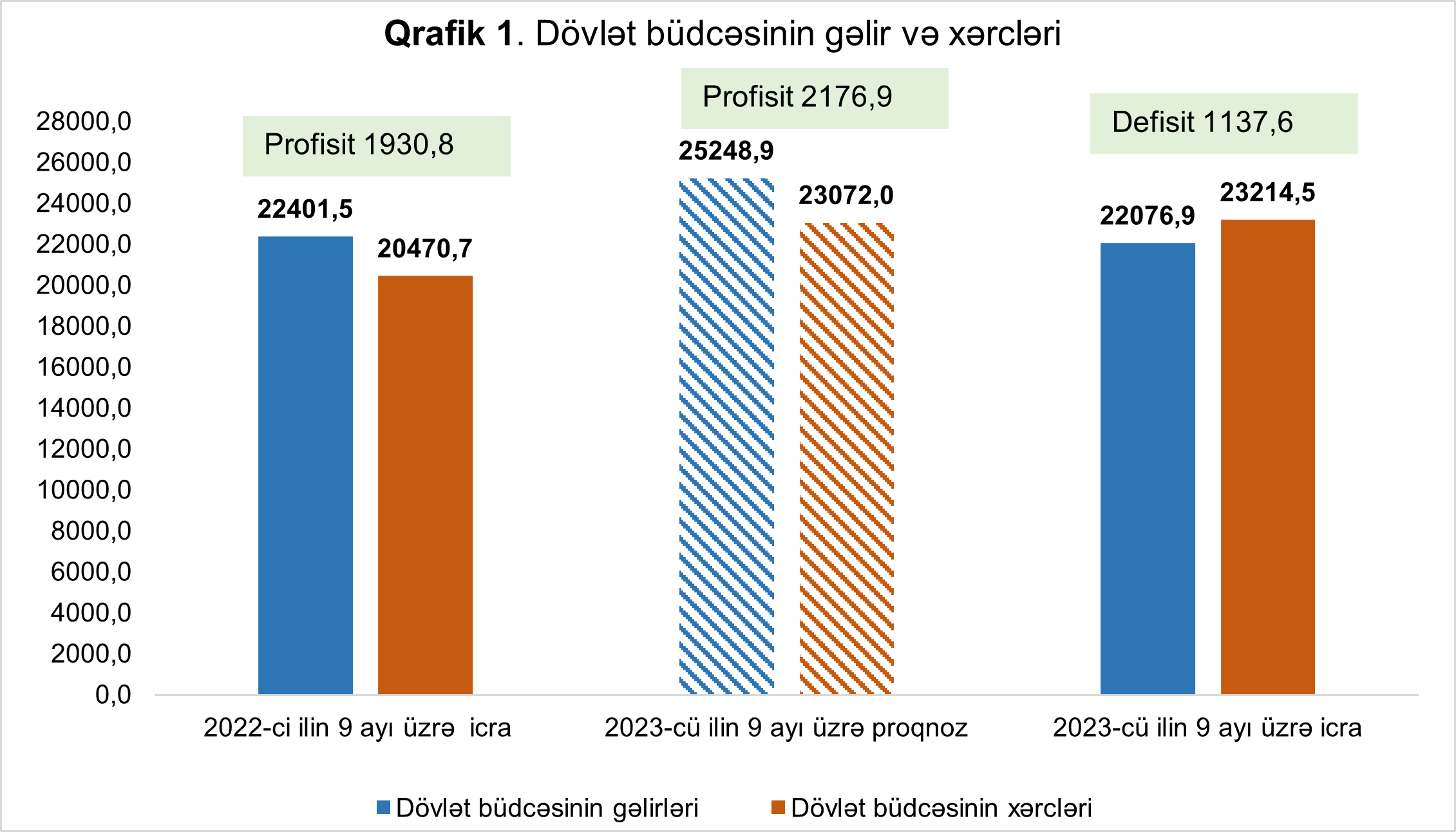 2023-cü ilin doqquz ayı ərzində icmal büdcənin gəlirləri 36 milyard 889,3 milyon manat olmuşdur ki, bu da ötən ilin eyni dövrü ilə müqayisədə 7 milyard 169,4 milyon manat və ya 24,1 faiz çoxdur. İcmal büdcənin xərcləri isə 25 milyard 898,4 milyon manat icra olunmuşdur ki, bu da ötən ilin eyni dövrü ilə müqayisədə 3 milyard 328,8 milyon manat və ya 14,7 faiz çoxdur. İcmal büdcədə 10 milyard 990,9 milyon manat büdcə artıqlığı (profisit) yaranmışdır.