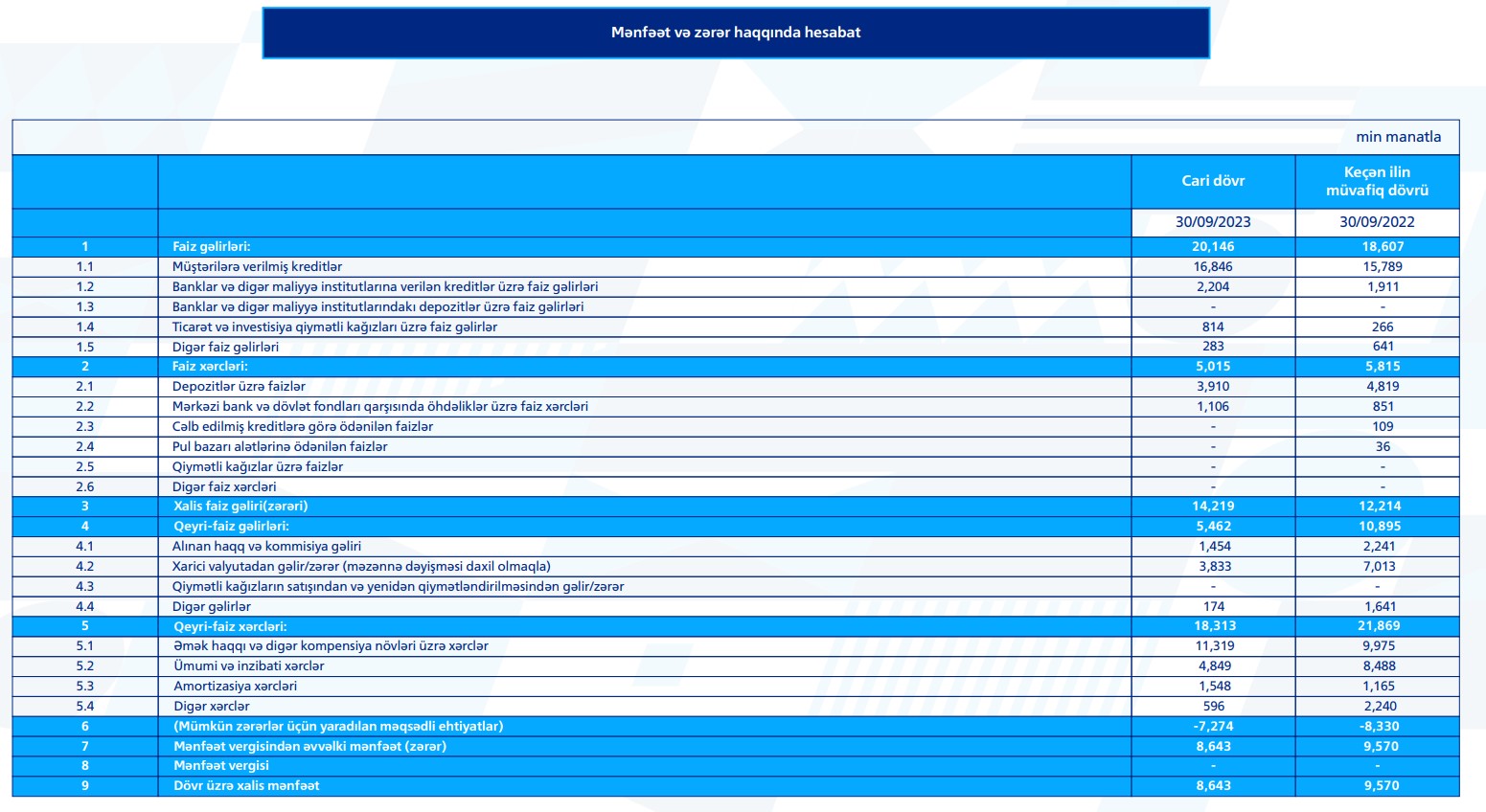 Müqayisə üçün qeyd edək ki, 2022-ci ilin 9 ayında "Bank VTB Azərbaycan"ın cəmi əməliyyat gəlirləri 29 milyon 502 min manat, cəmi əməliyyat xərcləri 28 milyon 262 min manat, əməliyyat mənfəəti 1 milyon 240 min manat, ehtiyatlardan azad olan vəsait 8 milyon 330 min manat təşkil etmişdi.