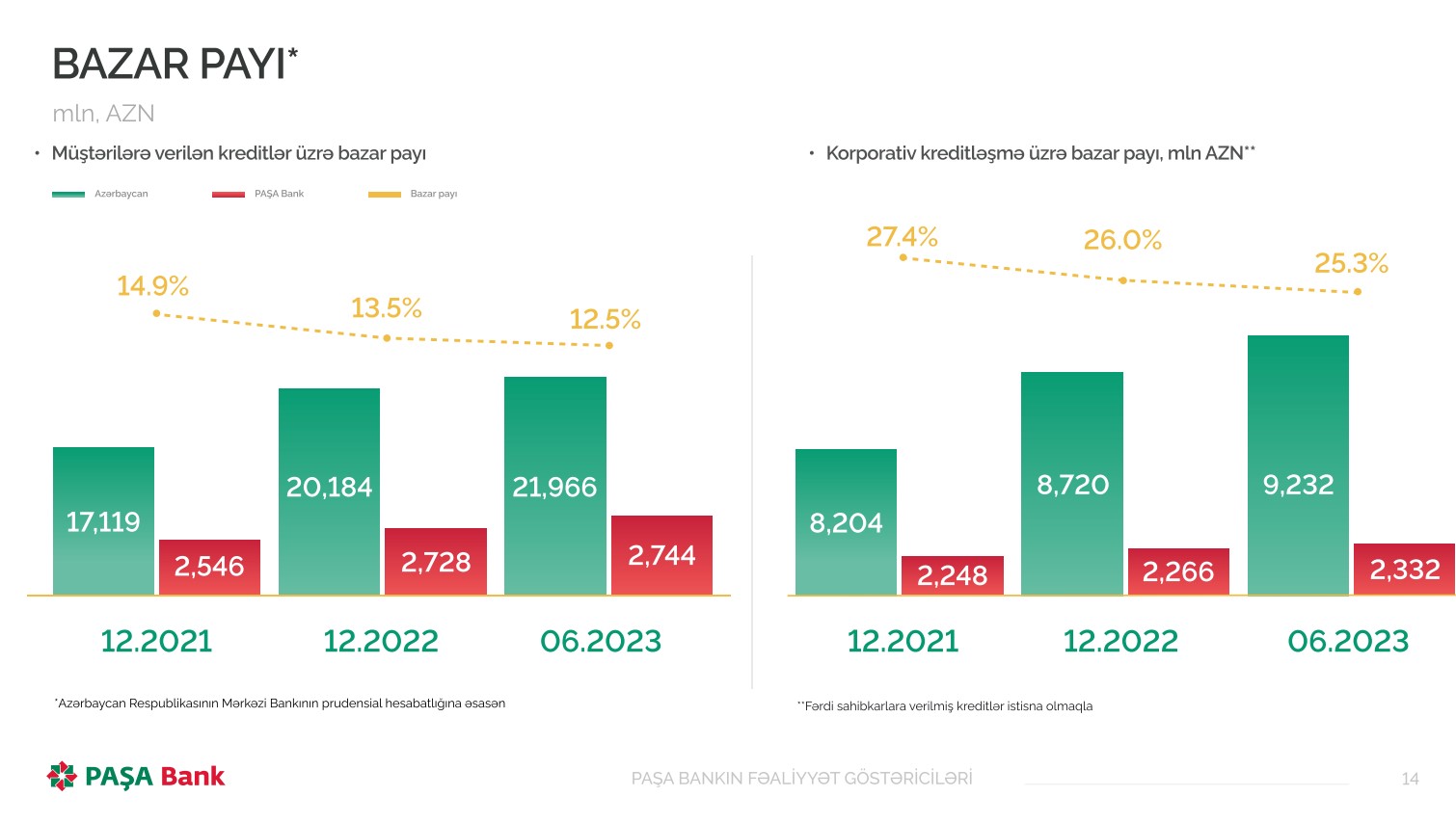 "PAŞA Bank"ın müştərilərə verilən kreditlər üzrə bazar payı 2,4 faiz bəndi azalaraq 12.5%-ə, korporativ kreditləşmə üzrə bazar payı isə 2,1 faiz bəndi azalaraq 25,3%-ə geriləyib.