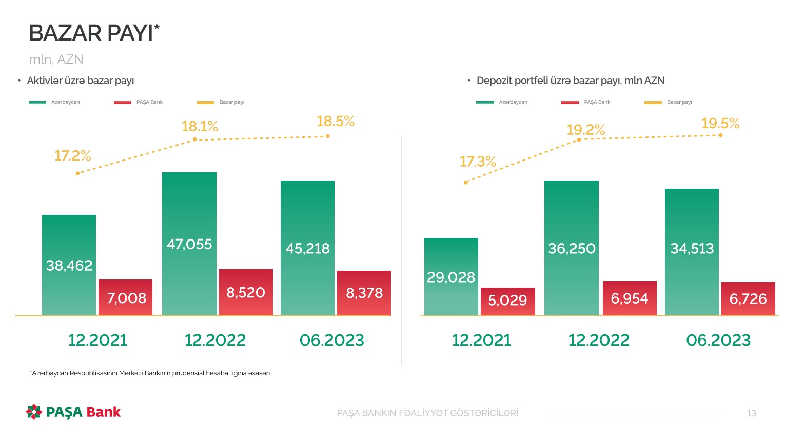 Süleymanov bildirib ki, 30 iyun 2023-cü il tarixində "PAŞA Bank"ın bazar payları - aktivlər üzrə 18.5%, müştərilərə verilən kreditlər üzrə 12.5%, o cümlədən korporativ kreditləşmə üzrə 25.3%, depozitlər üzrə 19.5% təşkil edib.