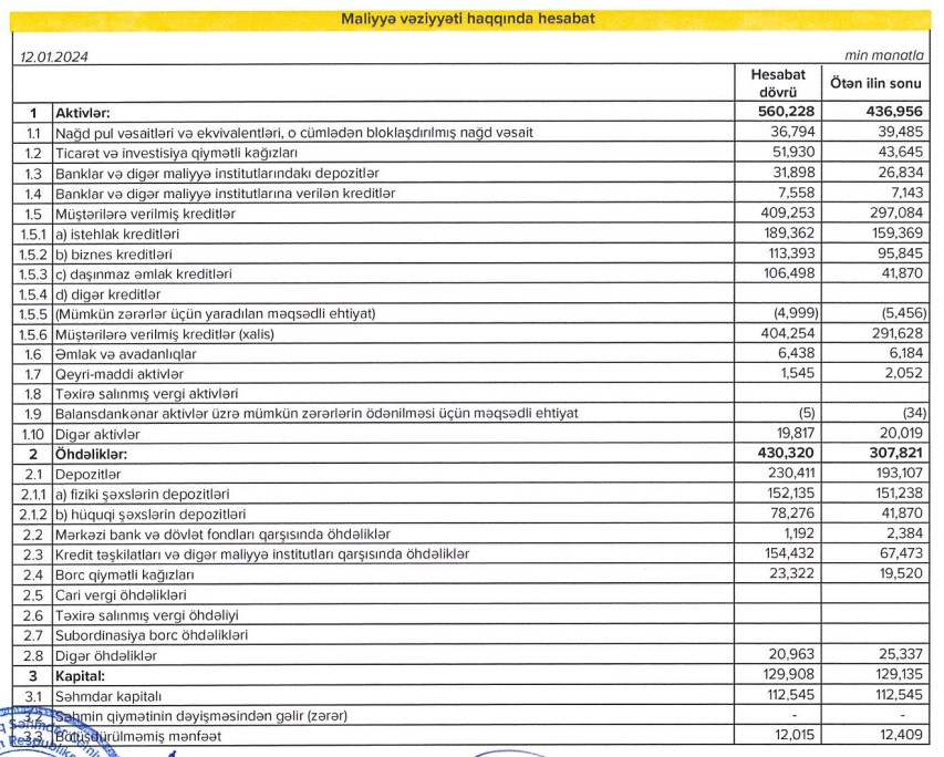Ötən il "Expressbank"ın cəmi aktivləri 123 milyon 272 min manat və ya 28,2% artaraq 31 dekabr 2023-cü il tarixində 560 milyon 228 min manata çatıb.