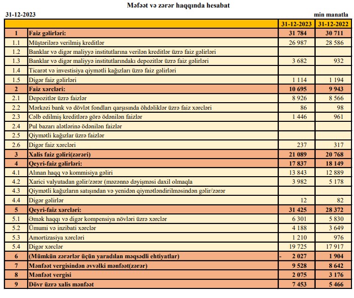 Müqayisə üçün qeyd edək ki, 2022-ci ildə "Premium Bank"ın cəmi əməliyyat gəlirləri 48 milyon 860 min manat, cəmi əməliyyat xərcləri 38 milyon 315 min manat, əməliyyat mənfəəti 10 milyon 545 min manat təşkil etmişdi. Bank əməliyyat mənfəətindən 1 milyon 904 min manat ehtiyata ayırmış və 3 milyon 176 min manat mənfəət vergisi ödəmişdi.