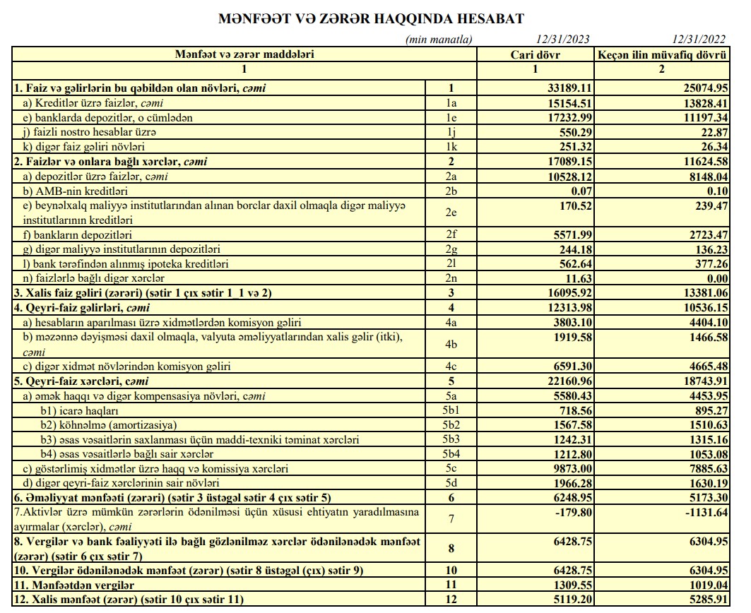Beləliklə, ASB-nin xalis mənfəəti 2023-cü ildə 2022-ci illə müqayisədə 167 min manat və ya 3,2% azalıb. Xalis mənfəətin cüzi azalması aktivlər üzrə mümkün zərərlərin ödənilməsi üçün xüsusi ehtiyatdan qayıdan vəsaitin azalması ilə əlaqədardır. Bankın cari fəaliyyətinin nəticəsini daha dolğun əks etdirən əməliyyat mənfəəti artıb.