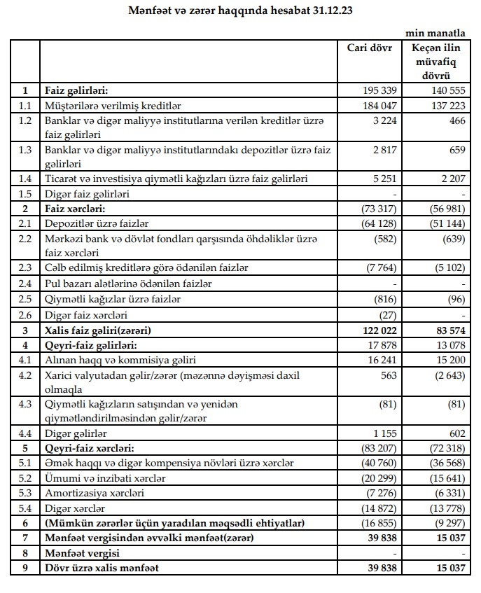 Müqayisə üçün qeyd edək ki, 2022-ci ildə "AccessBank"ın cəmi əməliyyat gəlirləri 153 milyon 633 min manat, cəmi əməliyyat xərcləri 129 milyon 299 min manat, əməliyyat mənfəəti 24 milyon 334 min manat, mümkün zərərlər üçün yaradılan məqsədli ehtiyatlara ayırma 9 milyon 297 min manat təşkil etmişdi.