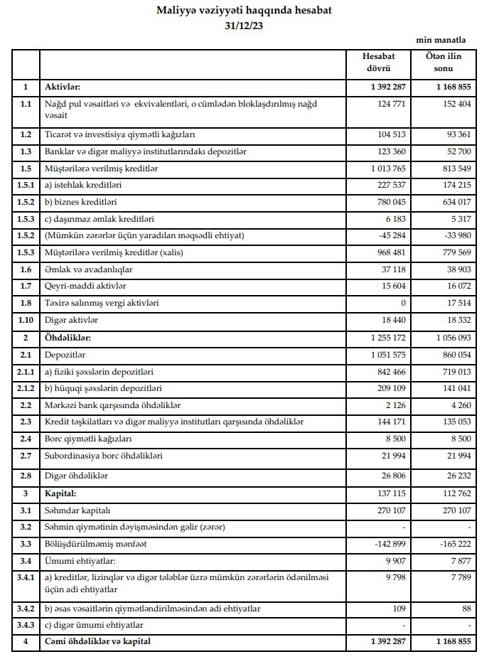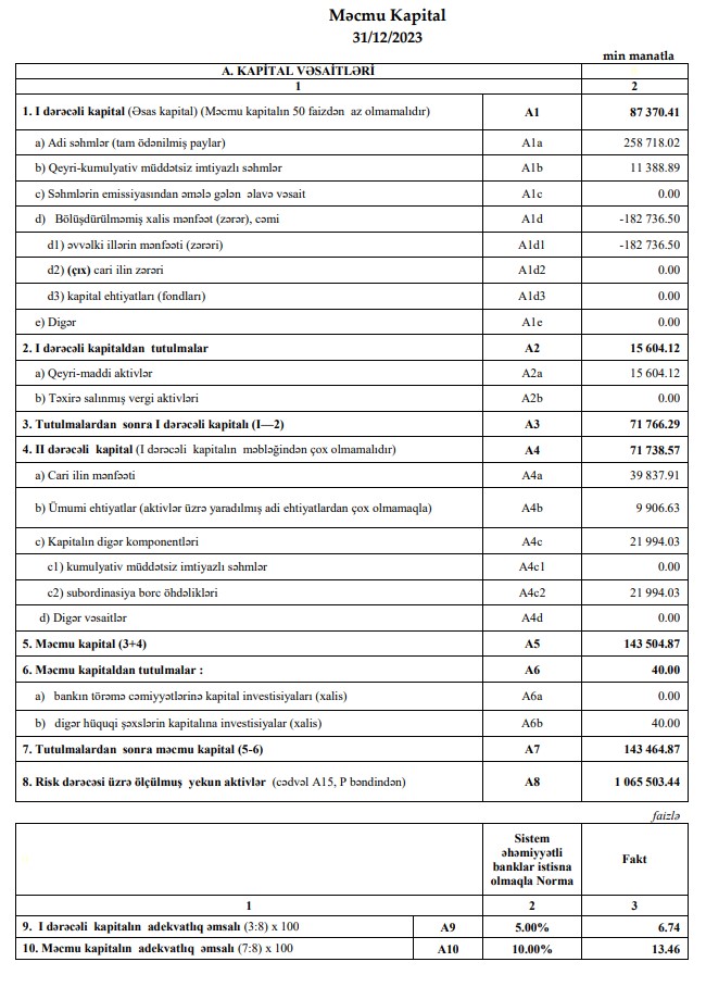 31 dekabr 2023-cü il tarixində "AccessBank" 143 milyon 465 min manat məcmu kapitala malik olub.