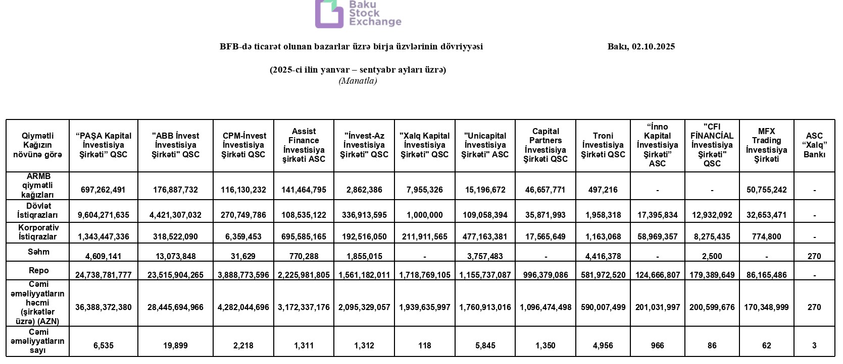 Marja.az Birjaya istinadən xəbər verir ki, “PAŞA Kapital İnvestisiya Şirkəti” QSC 36 milyard 388 milyon 372 min manat dövriyyə ilə 1-ci, "ABB İnvest İnvestisiya Şirkəti" QSC 28 milyard 445 milyon 695 min manat dövriyyə ilə 2-ci, "CPM-İnvest İnvestisiya Şirkəti" QSC 4 milyard 282 milyon 45 min manat dövriyyə ilə 2-ci yeri tutub.