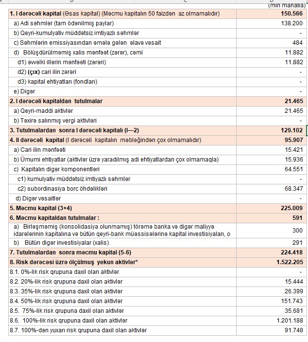 Bankın kapital və aktiv bazasında yüksək artım qeydə alınıb. Məcmu kapital 33% artaraq, 224 milyon manata çatıb, aktivlərin həcmi isə 192 milyon manat artaraq 1,9 milyard manatı ötüb.