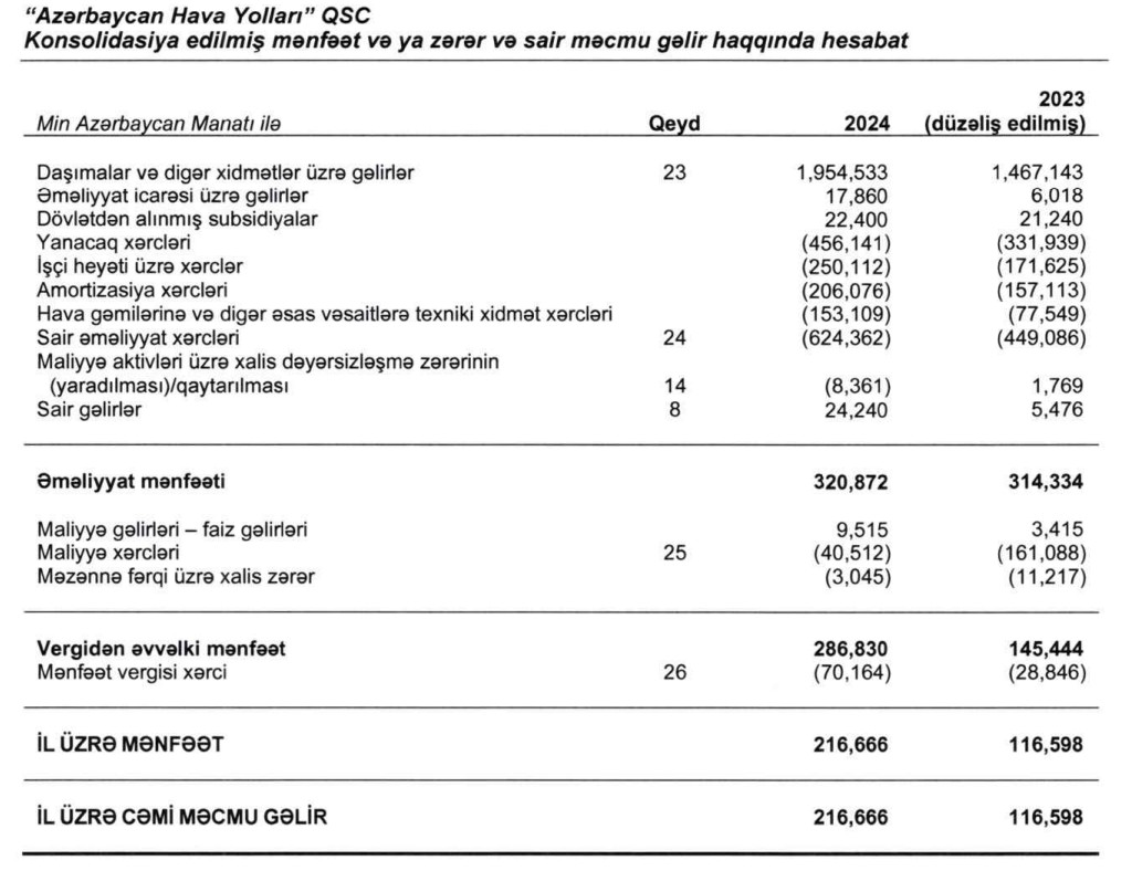 Quru sərhədlərin bağlı olması və uçuş coğrafiyasının genişləndirilməsi "Azərbaycan Hava Yolları" QSC-nin (AZAL) maliyyə göstəricilərinə müsbət göstərib. AZAL 2024-cü ili 216 milyon 666 min manat xalis mənfəət ilə başa vurub. Halbuki, Şirkət 2023-cü ili 116 milyon 598 min manat xalis mənfəət ilə bağlamışdı. Beləliklə, AZAL-ın xalis mənfəəti 2024-cü ildə 2023-cü illə müqayisədə 100 milyon 68 min manat və ya 85,8% artıb. Əməliyyat icarəsi üzrə gəlirlərin, sair gəlirlərin, maliyyə gəlirlərinin (faiz gəlirlərinin) artması və maliyyə xərclərinin kəskin azalması hesabına dövlət şirkətinin xalis mənfəətində artım baş verib.