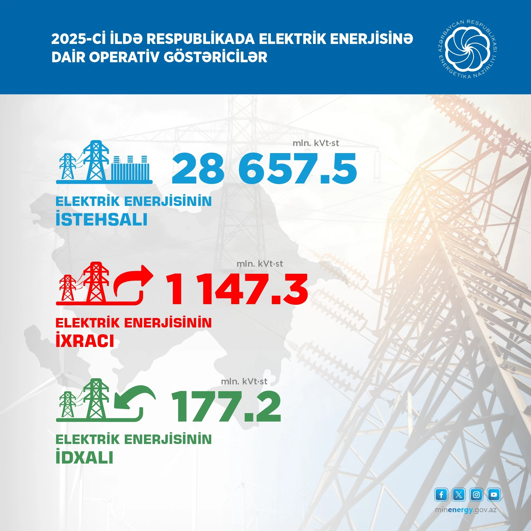 2025-ci il üzrə operativ məlumatlara əsasən, Azərbaycanda elektrik enerjisinin istehsalı 262,3 mln. kVt·st, yəni 0,9 % artaraq 28 657,5 mln. kVt·st olub.