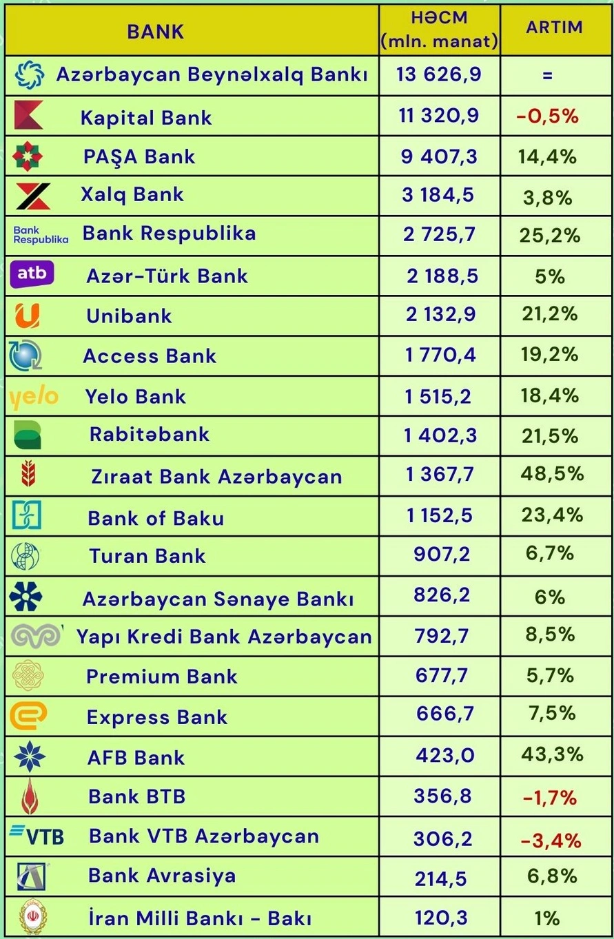 Bunlar, “Azərbaycan Beynəlxalq Bankı” (ABB) (13 milyard 626,9 milyon manat), “Kapital Bank” (11 milyard 320,9 milyon manat), “PAŞA Bank” (9 milyard 407,3 milyon manat), “Xalq Bank” (3 milyard 184,5 milyon manat) və “Bank Respublika”dır (2 milyard 725,7 milyon manat).