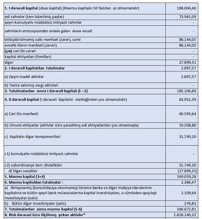 Bankın məcmu kapitalı 2025-ci ilin sonunda 266 milyon 673 min manat səviyyəsində olub. 2024-cü ilin məcmu kapitalı 222 milyon 297 min manat idi və bu da 44 milyon 376 min manat və ya 20,0% artım deməkdir. Kapitalın artımı bankın dayanıqlılıq göstəricilərini gücləndirir və risklərin daha etibarlı şəkildə idarə olunmasına imkan yaradır. Bu artım bankın genişlənmə strategiyasını dəstəkləyən mühüm faktor kimi qiymətləndirilir.