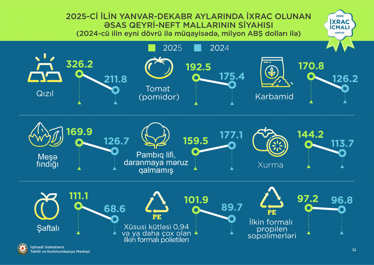 2025-ci ilin yanvar-dekabr aylarında ixrac olunan şəkər əvvəlki ilin müvafiq dövrünə nəzərən 57,4%, meyvə-tərəvəz 27,4%, alüminium və onlardan hazırlanan məmulatlar 24,2%, pambıq iplik 19,3%, kimya sənayesi məhsulları 8%, bitki və heyvan mənşəli piylər və yağlar 2% artıb.