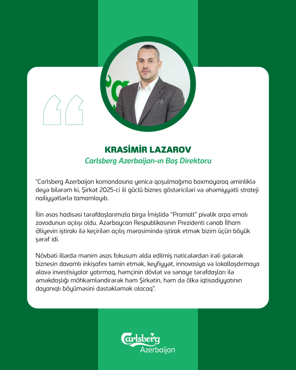 Növbəti illərdə mənim əsas fokusum əldə edilmiş nəticələrdən irəli gələrək biznesin davamlı inkişafını təmin etmək, keyfiyyət, innovasiya və lokallaşdırmaya əlavə investisiyalar yatırmaq, həmçinin dövlət və sənaye tərəfdaşları ilə əməkdaşlığı möhkəmləndirərək həm Şirkətin, həm də ölkə iqtisadiyyatının dayanıqlı böyüməsini dəstəkləmək olacaq,” – Krasimir Lazarov, Carlsberg Azerbaijan-ın Baş direktoru qeyd edib.