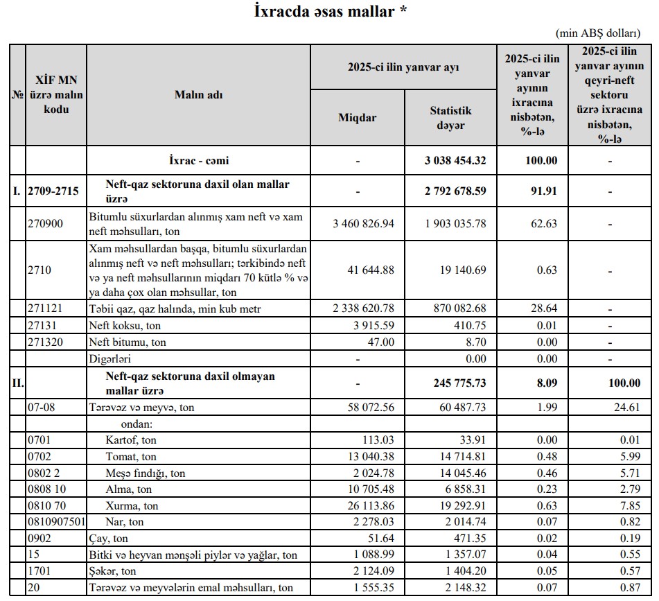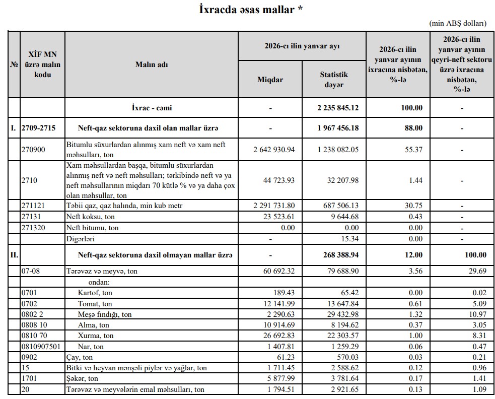 2026-cı ilin Yanvar ayında Azərbaycanın ixracının dəyərinin 88%-i neft-qaz sektoruna daxil olan mallar, 12%-i neft-qaz sektoruna daxil olmayan mallar üzrə formalaşıb.
