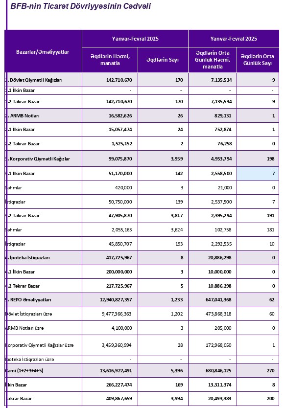 2025-ci ilin yanvar-fevral ayları ərzində (ilk 2 ayda) Bakı Fond Birjasında (BFB) əqdlərin cəmi həcmi 13 milyard 616 milyon 922 min manat təşkil edib.