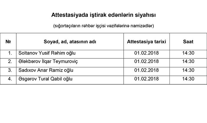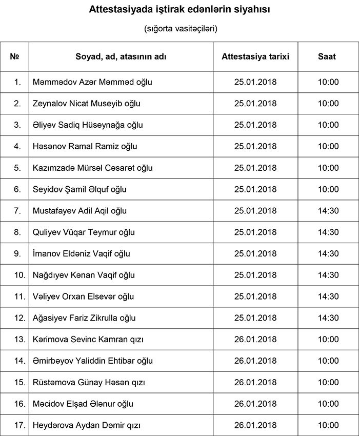 Maliyyə Bazarlarına Nəzarət Palatası tərəfindən 25 yanvar - 01 fevral 2018-ci il tarixlərində sığorta vasitəçiliyi üzrə fəaliyyətə lisenziyanın verilməsi üçün attestasiyanın keçirilməsi nəzərdə tutulur.