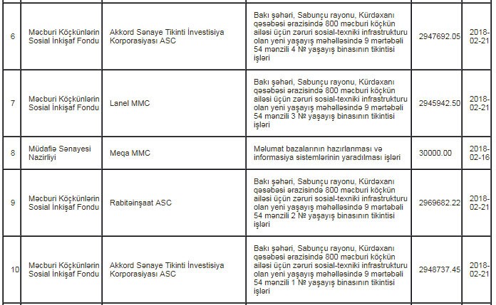 Bundan başqa, "Lanel" MMC ilə 2 mln. 945,942 min manatlıq və "Rabitəinşaat" ASC ilə 2 mln. 969, 682 min manatlıq müqavilə bağlanıb.