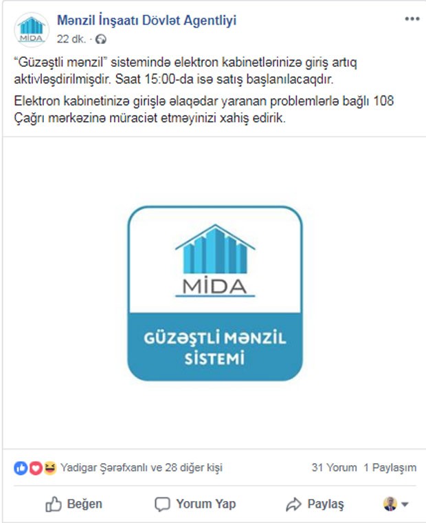 Bu barədə Mənzil İnşaatı Dövlət Agentliyinin (MİDA) vətəndaşlara müraciətində bildirilir.