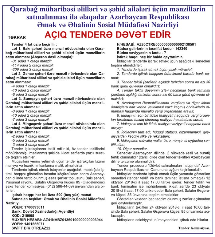 Qarabağ müharibəsi əlilləri və şəhid ailələri üçün mənzillərin satınalınması ilə əlaqədar Azərbaycan Respublikası Əmək və Əhalinin Sosial Müdafiəsi Nazirliyi açıq tender elan edir: