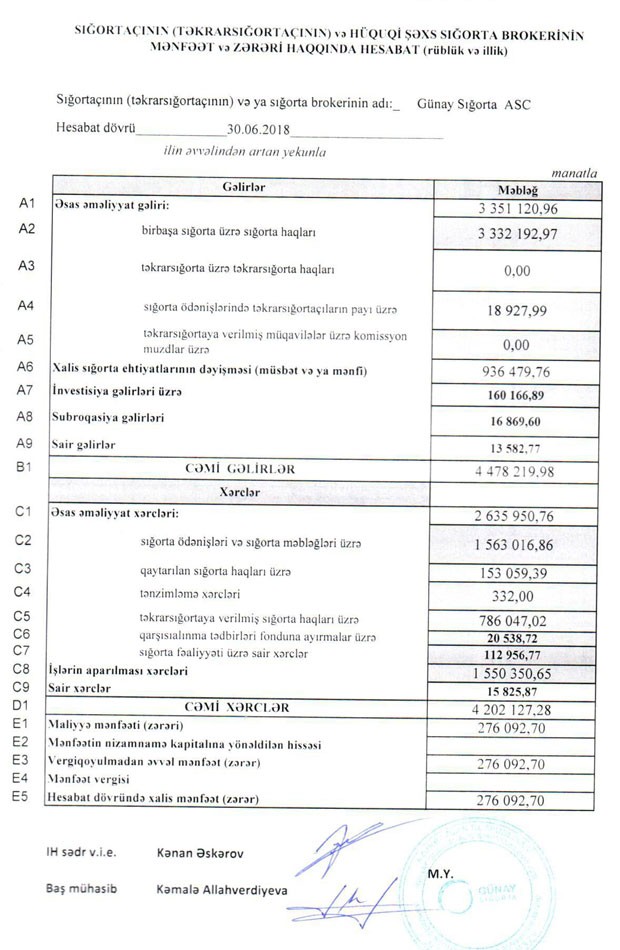 “Günay Sığorta” ASC 2018-ci ilin birinci yarısını 276 min 92 manat xalis mənfəətlə başa vurub. Bu, 2016 və 2017-ci ilin mənfəətlərindən belə çoxdur.