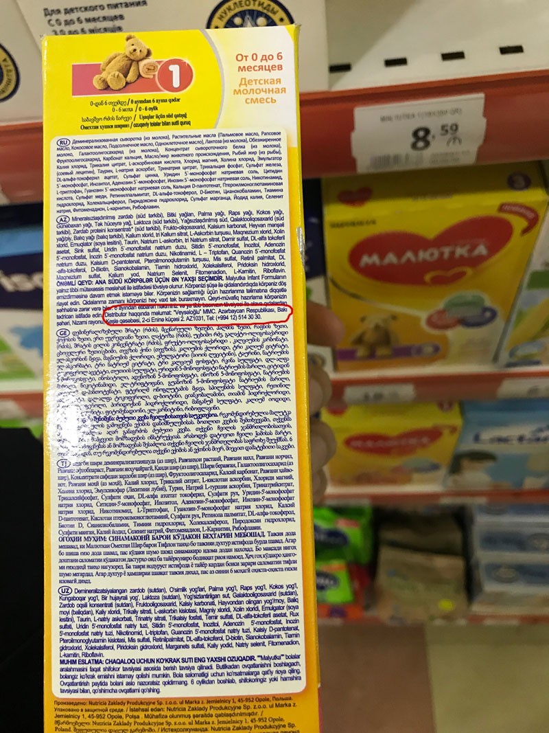 Məsələn, satışda istehsal tarixi, 18.11.2018, 03.12.2018-ci il tarixiləri olan qidaların üzərində distribütorun “Veysəloğlu” MMC olduğu göstərilib. Əgər “Veysəloğlu” MMC 2018-ci ilin Noyabr ayından “Nutricia” şirkətilə müqaviləsinin bitdiyini açıqlayırsa, nə üçün sonrakı tarixlərdə istehsal edilmiş “Malyutka” uşaq qidalarının üzərində distribütorun “Veysəloğlu” MMC olduğu yazılıb? Bu irəli istehsal tarixi yazmaq saxtakarlığıdır?. Yoxsa, əməkdaşlıq dayansa da, istehsalçı, üzərində “Veysəloğlu” MMC yazılan məhsulları yeni distribütor vasitəsilə Azərbaycana göndərməyə davam edib? Və ya burada bizneslərarası mübarizə gedir? Yaranan suallar çoxdur.