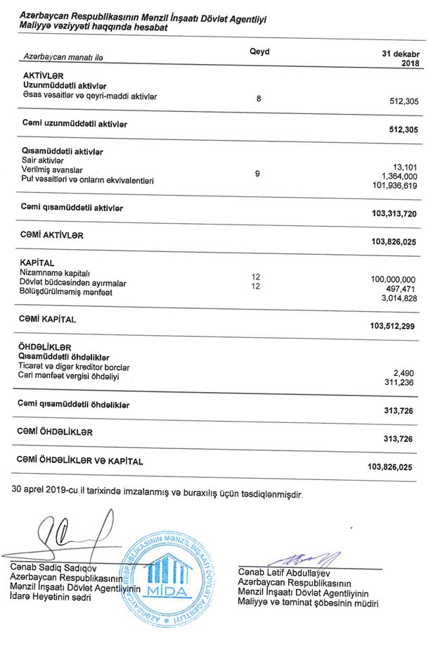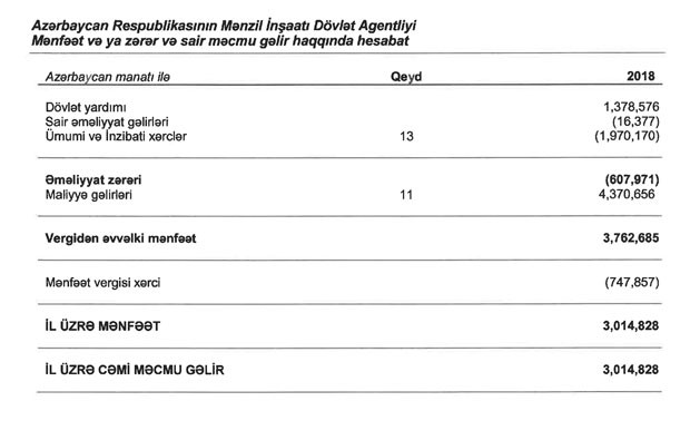 Mənzil İnşaatı Dövlət Agentliyi 2018-ci ili 3 milyon 15 min manat xalis mənfəət ilə başa vurub. Lakin bu gəlir əsas əməliyyatlardan əldə edilməyib.